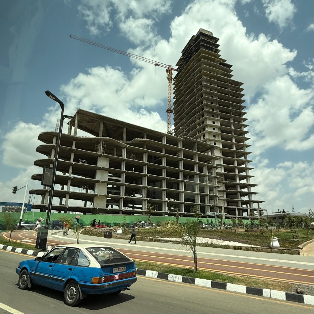 We began our trip in the capital city Addis Ababa (it means New Flower in Amharic). There is a massive construction boom occurring in the city, which befits one of the fastest growing economies in Africa, I suppose, (GDP up 3x in past 20 years) yet there are ongoing hardships resulting from a recent currency devaluation (50%) and there is a current hard currency crisis that prevents the government from importing enough fuel and other commodities. In cities across the country, thoroughfares are being widened, large tracts of land are being redeveloped wholesale and skyscrapers, condos and apartment blocks are springing up seemingly everywhere. It is clear that Prime Minister Abiy is working to push the country toward “Developed Nation” status, but not everyone is happy about all the building, and the choices of investment projects, especially those displaced by such works (who are, of course, typically poor and voice-less.)