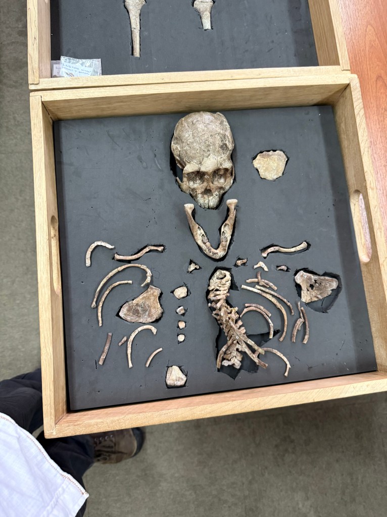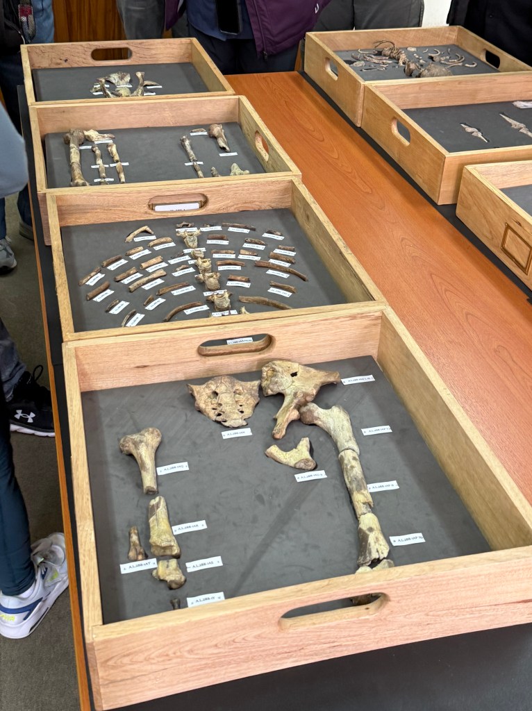 A highlight of this trip was an opportunity to visit the National Museum’s Paleontology Department where we met with one of the directors who took us on a backstage tour of their offices and allowed us to see the actual bones of Lucy, Selam and Ardi (an early hominid known as Ardipithicus Ramidus that predates Lucy by nearly a million years). Finding Lucy proved to be the “missing link” between apes and modern humans, particularly with her being fully bipedal and walking upright. Ardi’s find was important in that, while she was bipedal, she also had grasping toes as do modern apes, thus further solidifying the theory that modern apes and humans shared a common ancestor some 6-7Mya. I enjoyed getting all geeked out about seeing the actual bones of these remarkable beings vs the replicas I had seen in museums.