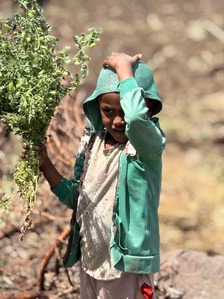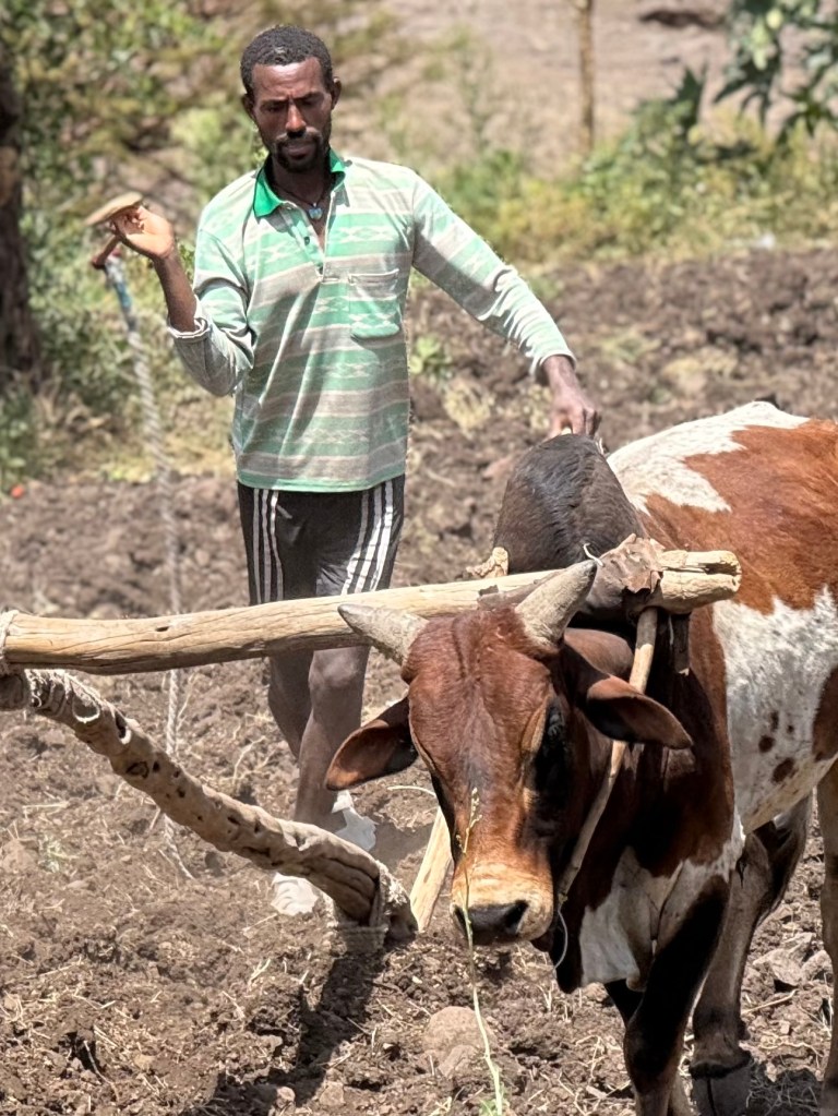These thoughts coalesced as we spent a few days in Lalibela, a small town of 25K situated halfway between the capital and the out-of-bounds areas to the north (Tigray & Eritrea). On the way from the airport we made an impromptu stop along the road to chat with farmers plowing their field. I found it fascinating to have a front row seat on farming practices that date back millennia: Ox-driven, manually steered wooden plows, kids harvesting onions and chickpeas in an adjacent field, all while the family goats and sheep rummage to and fro… Daily life for a billion people on our planet.
