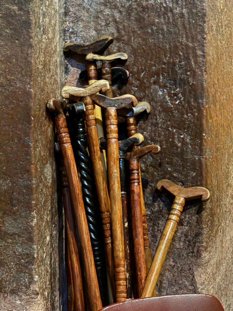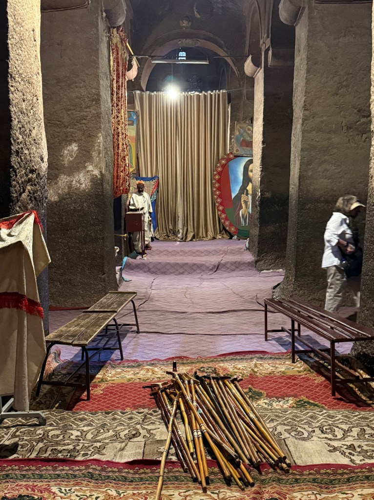 In each of the churches, there are small areas where congregants sit or stand, often leaning on staffs. Each staff is unique but each follows similar design, with a top end shaped similar to a whale tail, providing a suitable resting surface — welcome, I’m sure, given the 3 hour-long services.