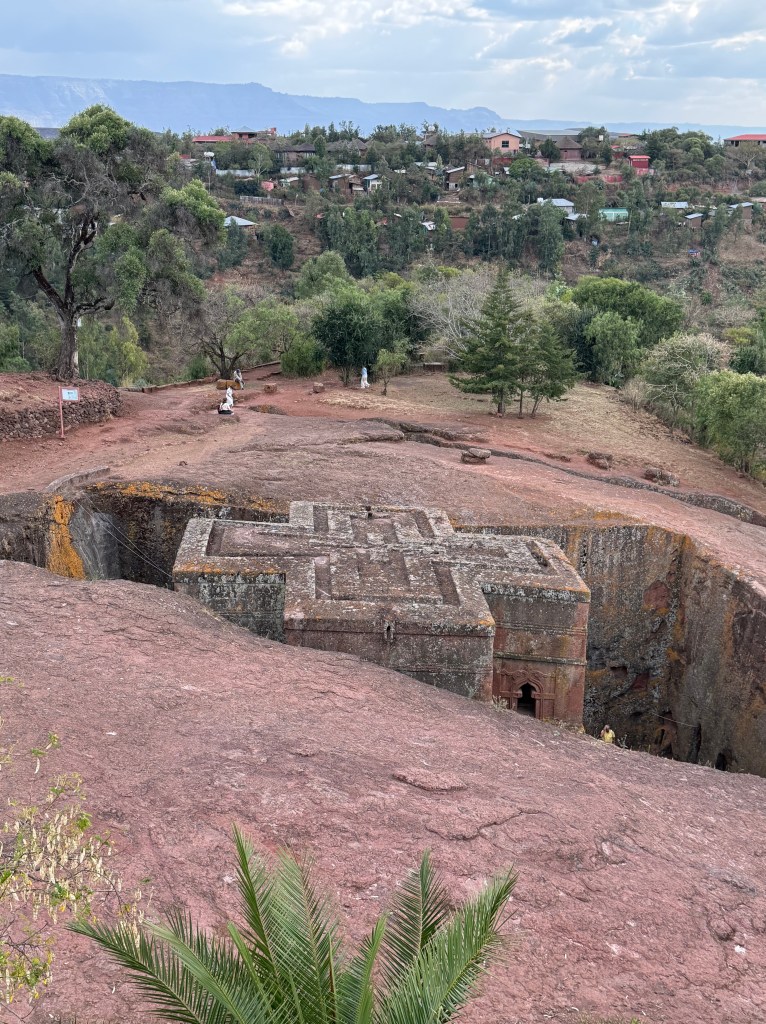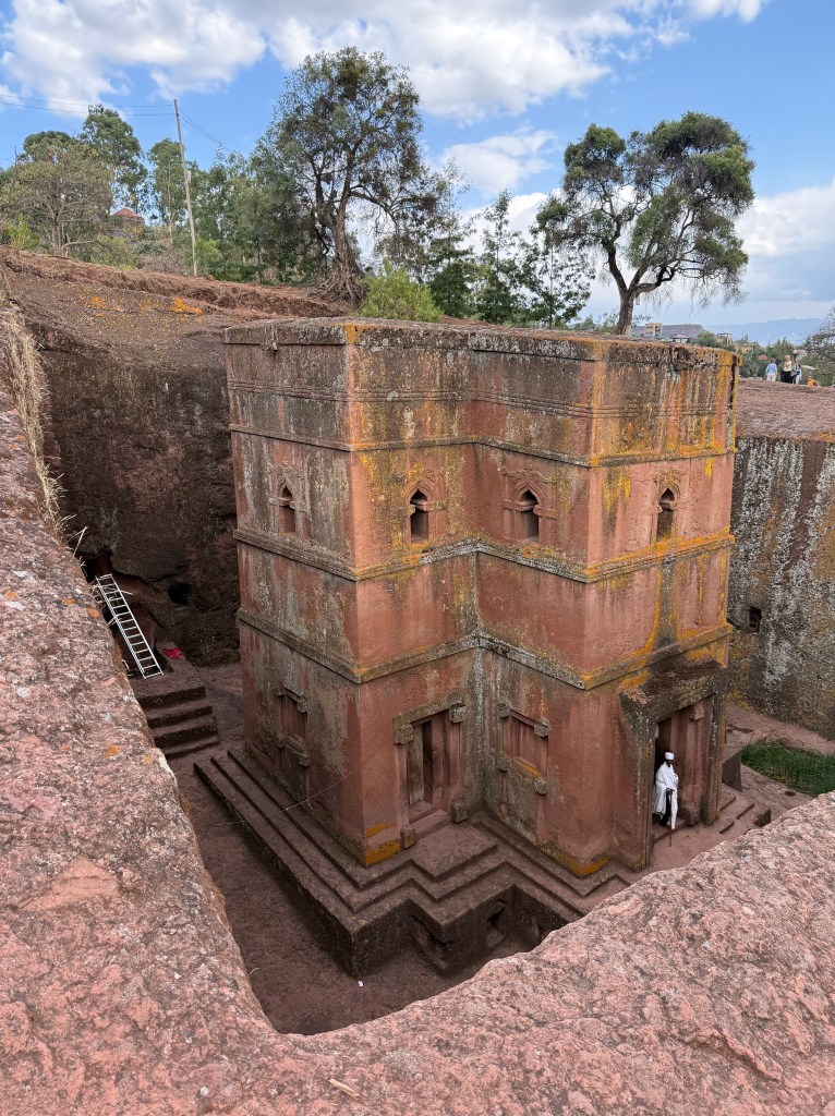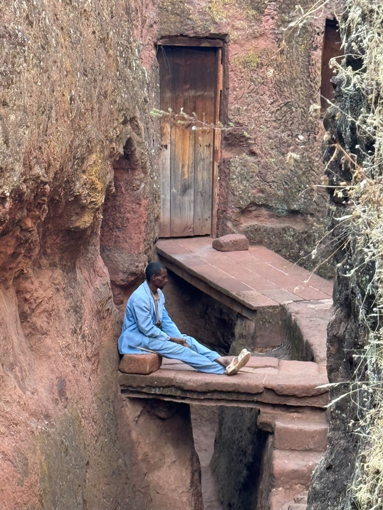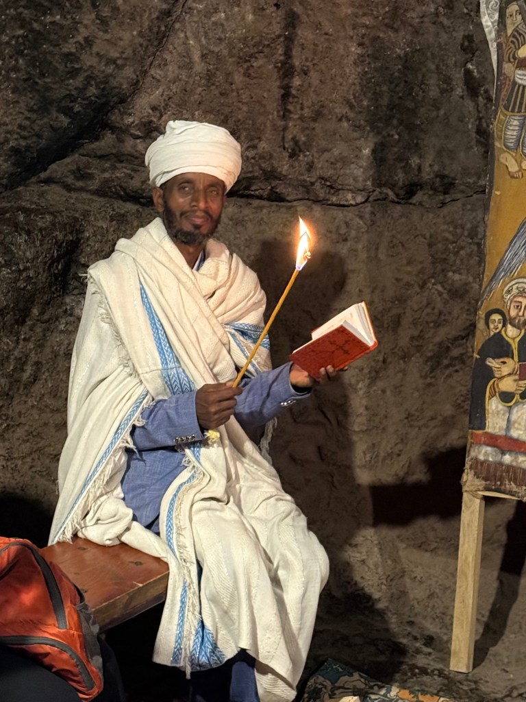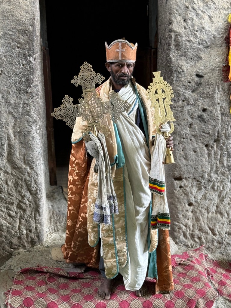 The churches are clustered in two groups and are interconnected by low, narrow tunnels. We had the chance to experience walking — hunched and shuffling and in utter darkness — through a section of tunnel between churches, all while chanting the Ethiopian Orthodox version of Kyrie Eleison (lord have mercy). I found it disorienting and claustrophobic and mesmerizing and enriching.