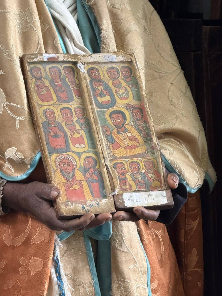 Generally void of interior painting or decoration, all of the churches we visited had freestanding framed paintings, each in traditional Orthodox styles, at the back of the churches, adjacent to the Holy of Holies where the sacraments, relics and other accoutrements are stored. The priests were so kind to show us their treasured manuscripts and crosses, many of which date back to the creation of these churches.