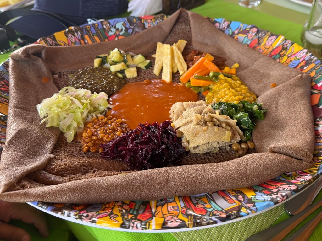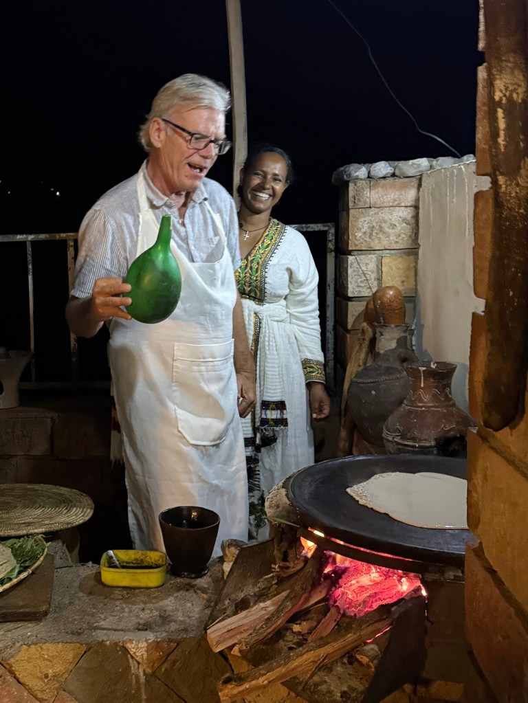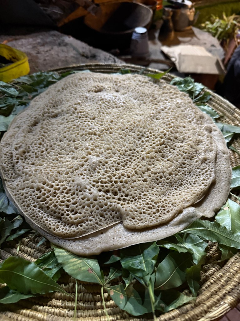 While in Lalibela, we had dinner with a middle class family with school-age children, gaining an understanding about their daily lives, hopes and concerns. It was also an opportunity to learn more about injera, the sourdough flatbread that is the staple food of Ethiopia. Made from teff, a high protein grain indigenous to Ethiopia, everyone eats injera, often multiple times per day.