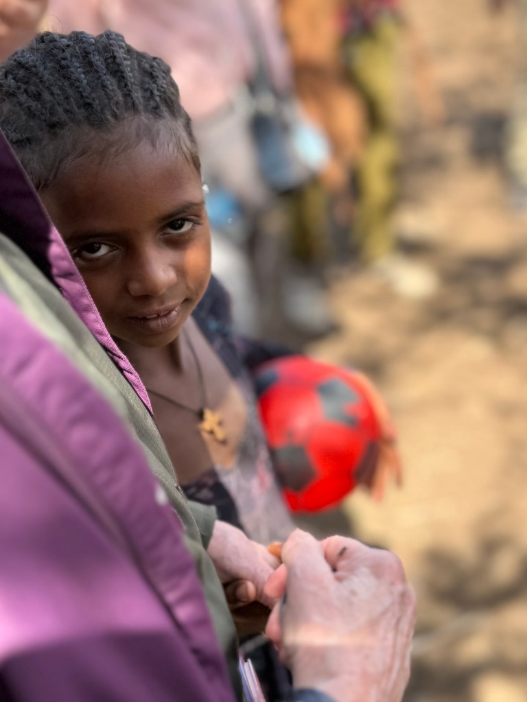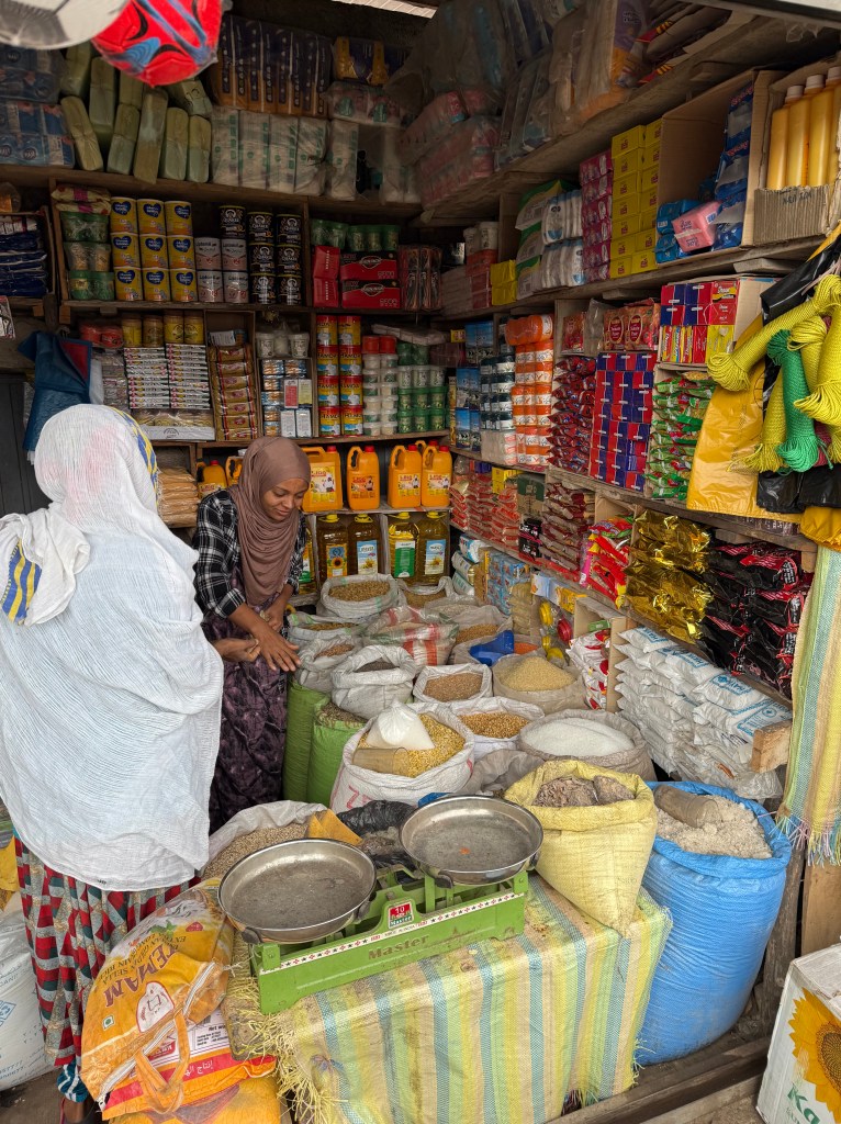 Prior to visiting the farming community, the team split into small groups, were given an allowance and a shopping list (in Amharic) and let loose in the market area to purchase items for our host families. It was much fun to interact with the shopkeepers. With 100 Birr ($0.75) leftover after purchasing cooking oil, we acquired a 9”ø red & black ball. When we met our hosts at the farm, one of the girls latched on to it (with mom’s permission, of course) before latching onto one of our group who has been the kid magnet. It’s so interesting to see how kids are so innately perceptive about people.