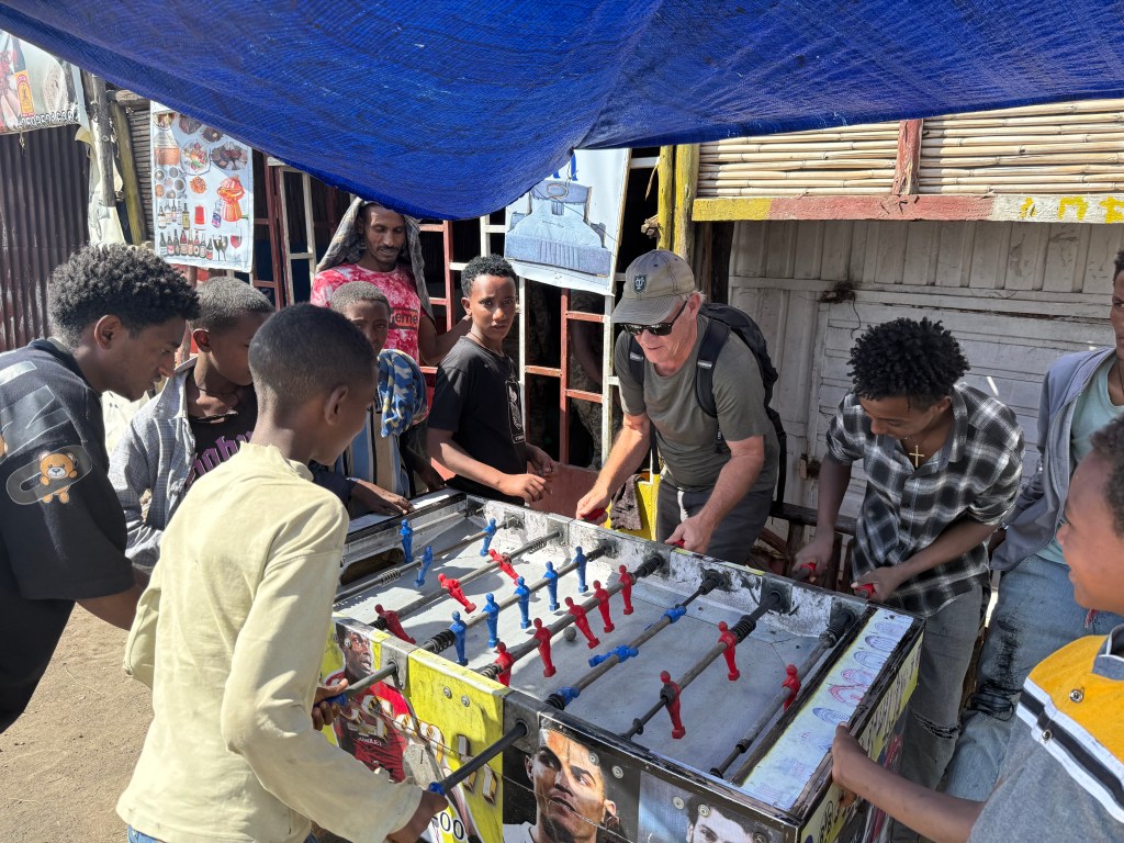 Soon we encountered a group of young men playing foosball (known as jotoni in Ethiopia), which, next to pool, seems to be a favorite pastime for this demographic. I’m super impressed by their skills, playing 3 balls at once — puts the bros back home to shame. We watched discreetly for a while then noticed an open table nearby. As Elias and I played, a crowd soon gathered and quickly we teamed up with locals for a lengthy battle royale. It was a complete blast: the competition made it fun; the connection made it unforgettable.