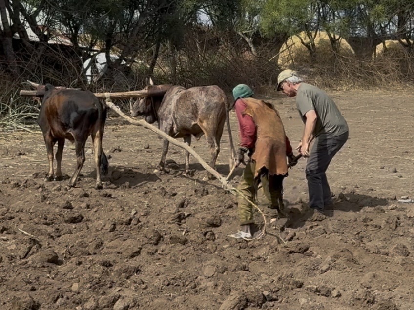 Despite having had experience with plowing fields on my aunt’s ranch as a teenager (with the assistance of a sturdy Ford tractor), I was ill-prepared for the old-school version of plowing – with a handmade, single shank cedar plow pulled by a pair of oxen. It was physically strenuous and mentally taxing trying to keep downward pressure on the plow, an eye on the plow line, watching for rocks and, oh, trying to coax the ox along too? I was exhausted after just a few tens of meters. A humbling, yet enlivening, experience.