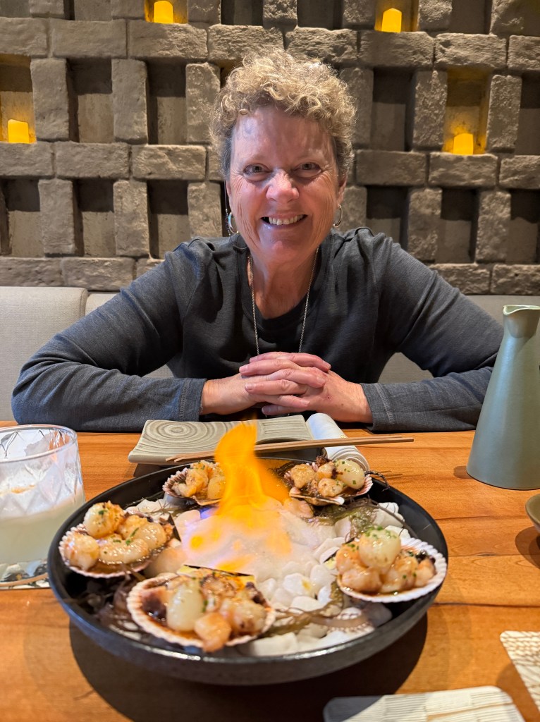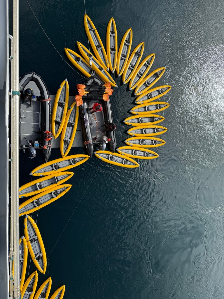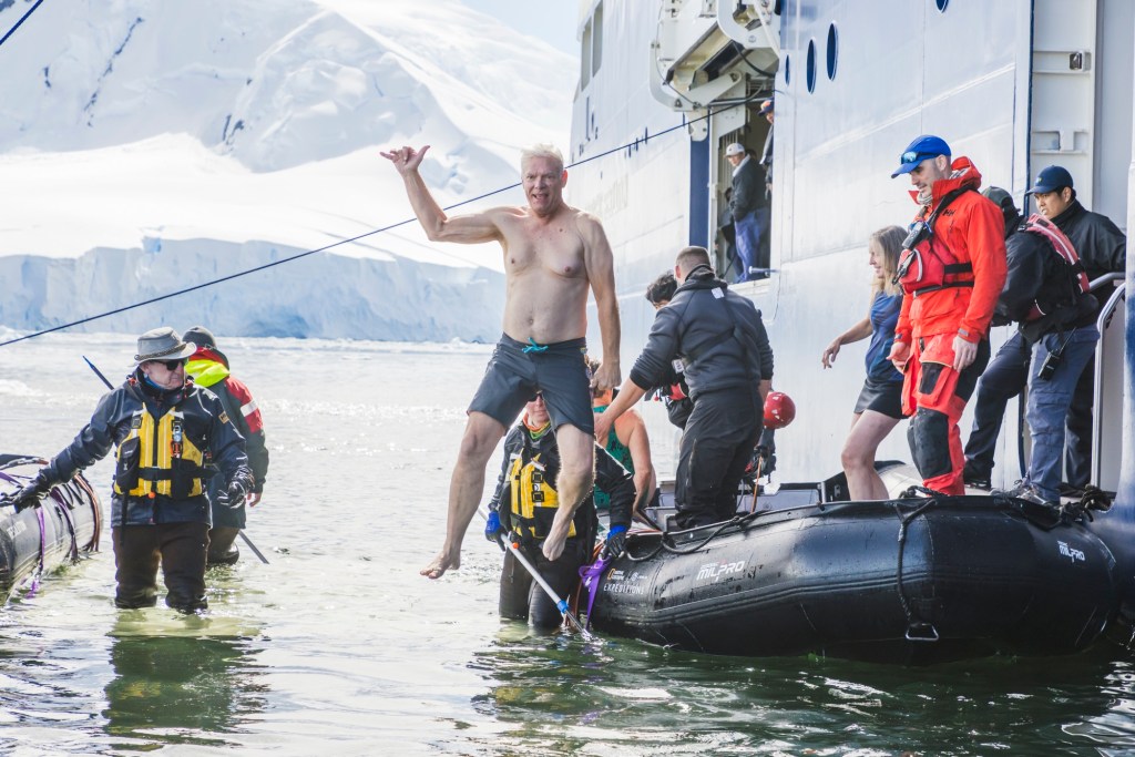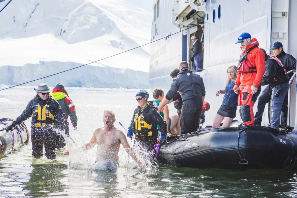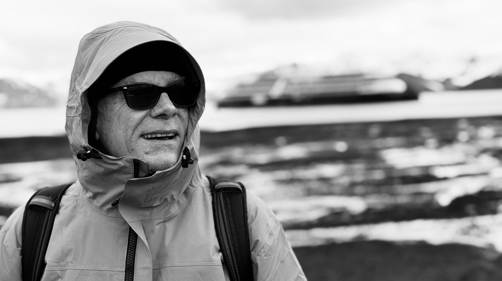Oh, and there was the (obligatory?) polar plunge, duly photographed (in excruciating detail) by a crack National Geographic photographer. Some sixty passengers, about half of our cohort, plus some crew members took part in this ritual. That evening, during the daily recap over the cocktail hour, the photographer showed some photos of the “plungers”, including my entire sequence of half a dozen shots, where I start off smiling, but as I became increasingly immersed in 1 degree Celsius seawater, that smile morphed into something like “aaaarrrgh…”. Utterly hilarious, if not humbling, to watch… Surprisingly, the plunge was not as physically uncomfortable as I had anticipated — numbness?, perhaps — but still, I’m glad we were tryful for this unique, edge-of-the-world experience.