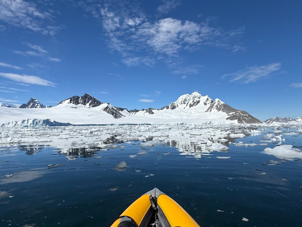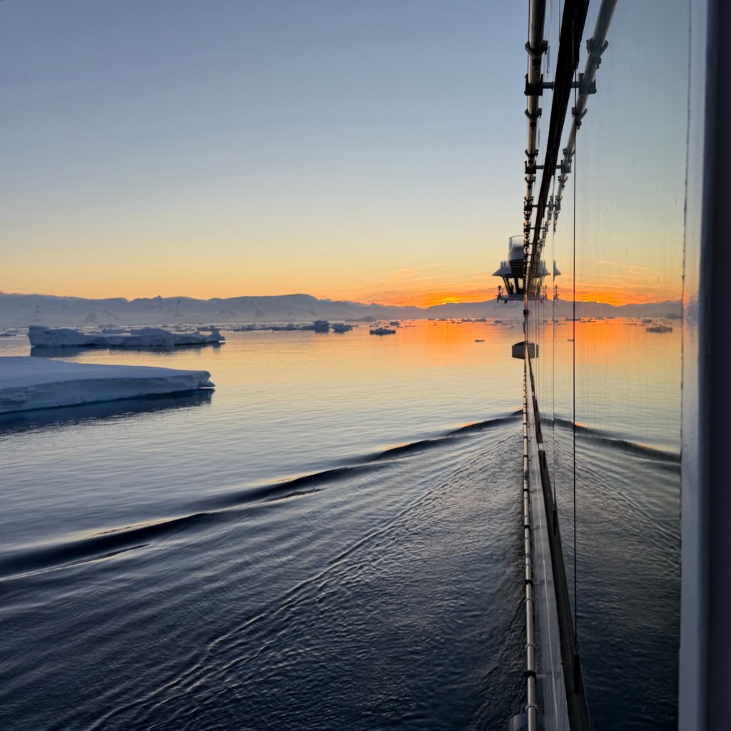While the entire experience was thoroughly enjoyable and most memorable, there are a few things that will stand out for a while: kayaking trips amongst the icebergs and whales and penguins, hiking on sea ice into which the captain plowed to park the ship, watching penguins steal rocks from each other for nest building, being on the bridge while the captain navigated narrow, marginally charted waters all chock-a-block with ice whilst a glacier calves and watching with twenty of our shipmates in rapt attention for nearly fifteen minutes as two penguins sought to reunite after one was intimidated by a 1 meter-wide crack in the sea ice — we all burst into applause when the trepidatious one finally made it across. There is something about such random, yet poignant, moments that I so enjoy encountering and which illustrate one of my favorite tenets: show up for life and life will show up for you, often in surprising and delightful ways.